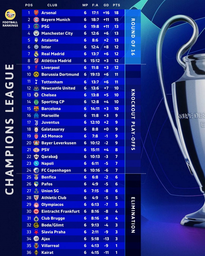 12月11日讯 欧冠联赛阶段第6轮结束,据数据统计排名机构Football Rankings分析,10分能确保晋级附加赛(前24名),现在已有15队确保满足该条件。目前欧冠联赛还剩最后两轮,将在明年1月进行。